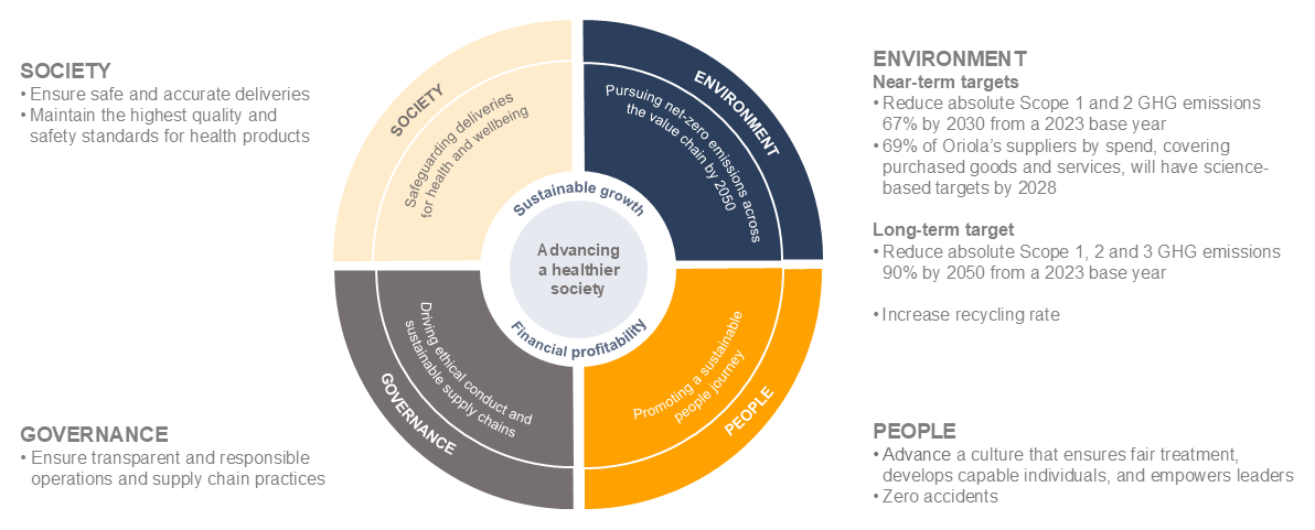 Oriola’s sustainability agenda has four themes: Environment, People, Society, and Governance.